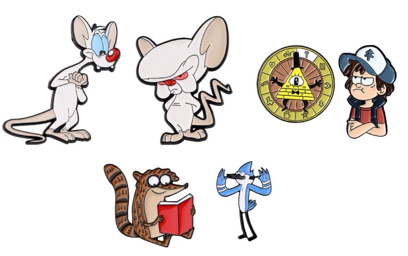 Красивые яркие значки с изображением любимых героев: Пинки, Брейна, Диппера, Билли Шифра, Мордекая и Ригби из популярных мультфильмов "Гравити Фолз", "Обычный мультик".