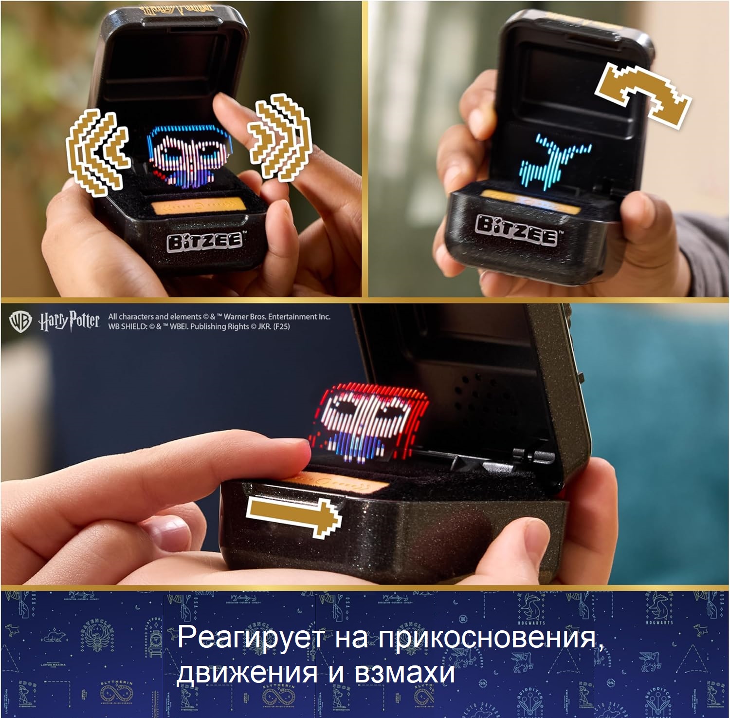 Откройте для себя магию волшебного мира с Bitzee Harry Potter. Персонажи Bitzee Harry Potter реагируют на прикосновения, движения, смахивания и наклоны очаровательными звуками и реакциями при каждом взаимодействии.