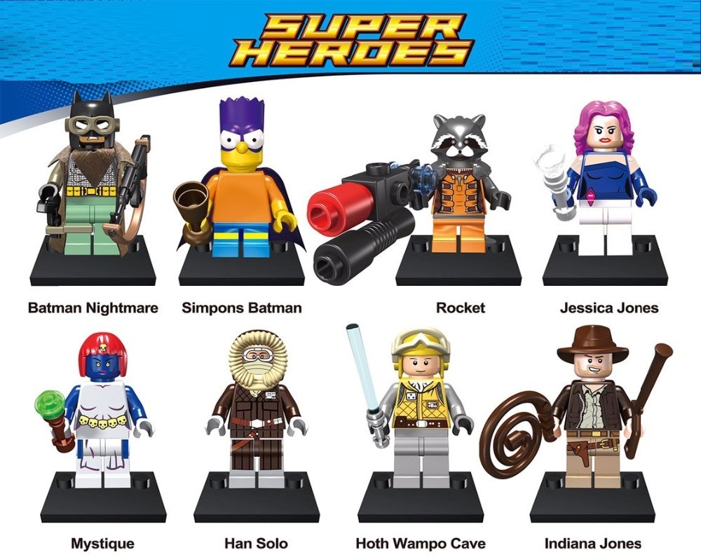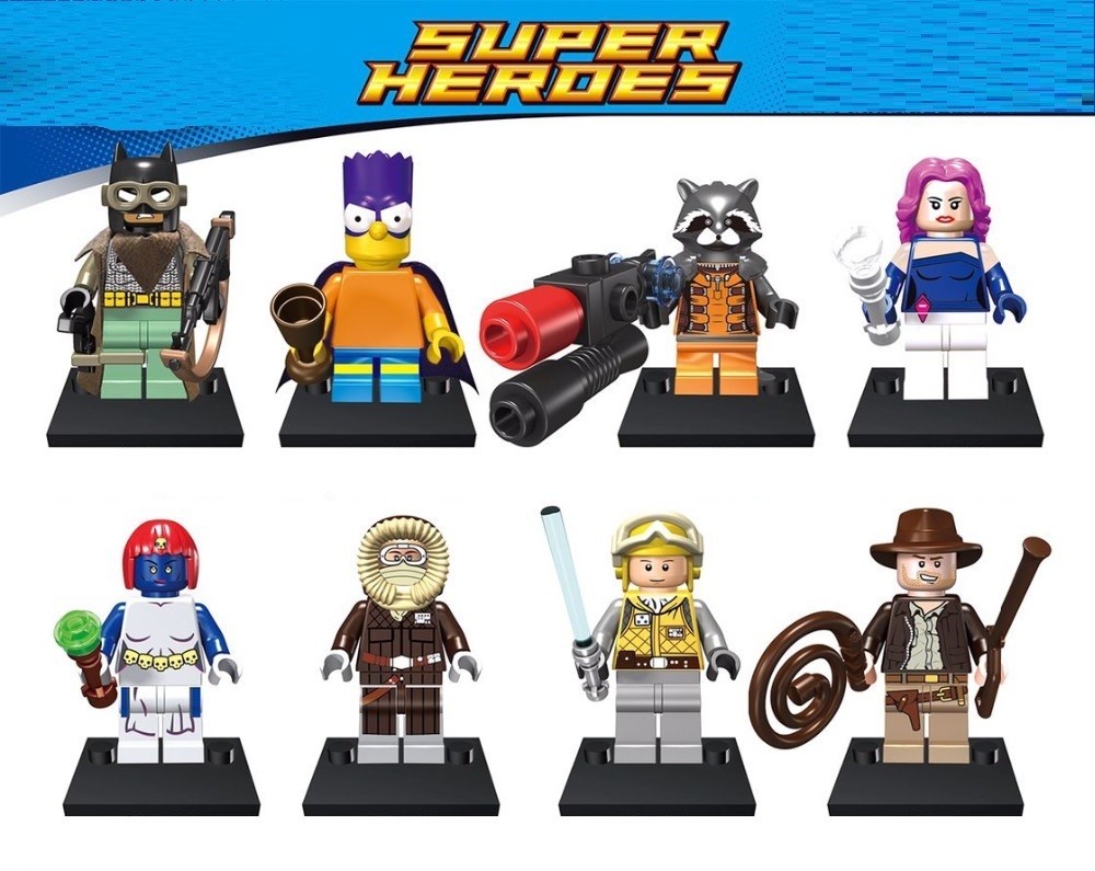 Минифигурки Популярные Супергерои серия 126. В наборе Популярных супергероев представлены персонажи фильмов и мультфильмов. Енот Ракета, Индиана Джонс, Мистик Хан Соло, Барт - Бэтмен, Бэтмен - Ночной кошмар и другие ждут новых приключений придуманных тобой и твоими друзьями. Мини фигурки выполнены из качественного пластика с отличной покраской, подвижными детальками, совместимы с другими конструкторами. Набор Популярных Супергероев оживит и дополнит ваши конструкторы новыми идеями и фантазиями. Цена указана за набор из восьми минифигурок. Конструктор без оригинальной упаковки.